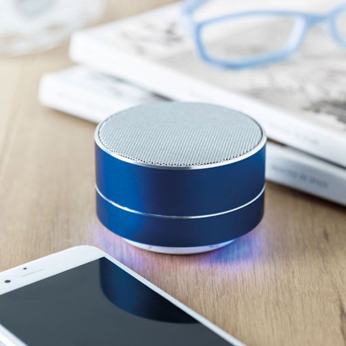 Aluminium 4.2 wireless speaker with rechargeable Li-on 450mAh battery and light at the bottom of the speaker. Output data: 3W, 4 Ohm and 5V. Micro USB cable included. Playing time aprox. 3h.