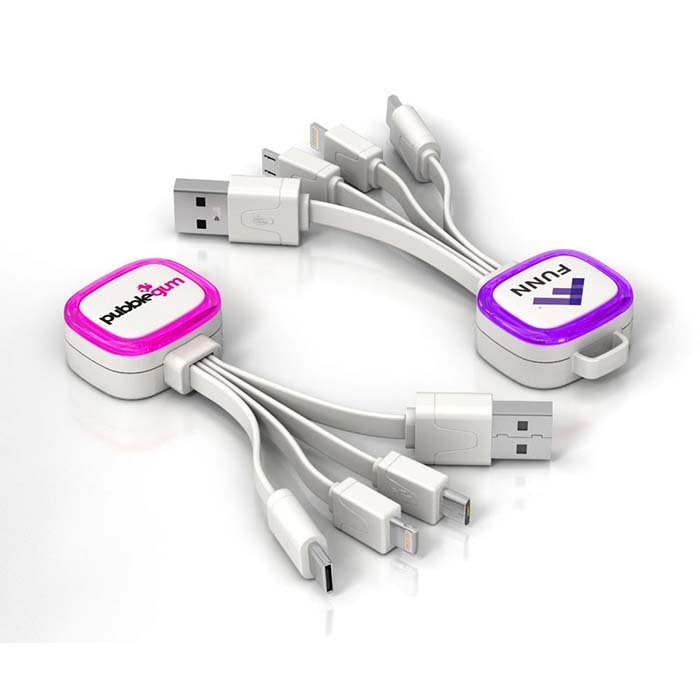 Charging cable connector with data transfer feature. Colourful illuminating trim to match your brand colours. Lightning for iPhone, Micro for Android, Type C and USB ports.