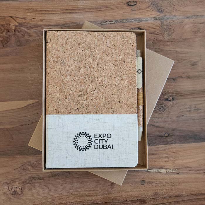 Sustainable A5 size notebook in eco friendly cork material with elastic closure and bookmark ribbon. Complemented with a pen made with wheatstraw and cork. Packed together in brown kraft paper gift boxes.