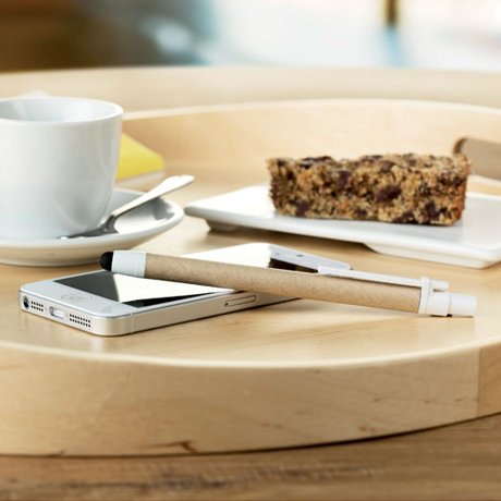 Automatic ball pen made with recycled carton barrel and ABS points and clip. Blue ink refill and touch tip for touch screens.