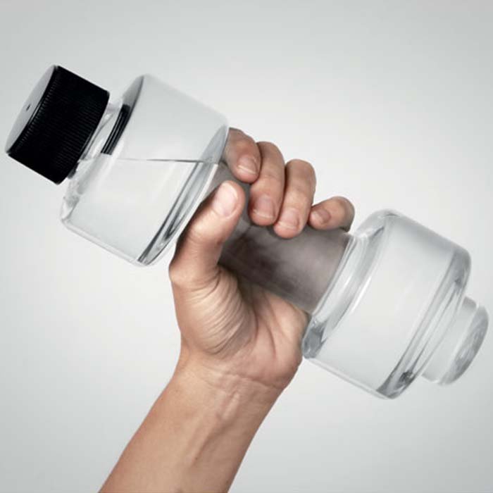 Dumbbell/weight shaped water bottle in PET which is BPA free. Capacity : 500 ml.