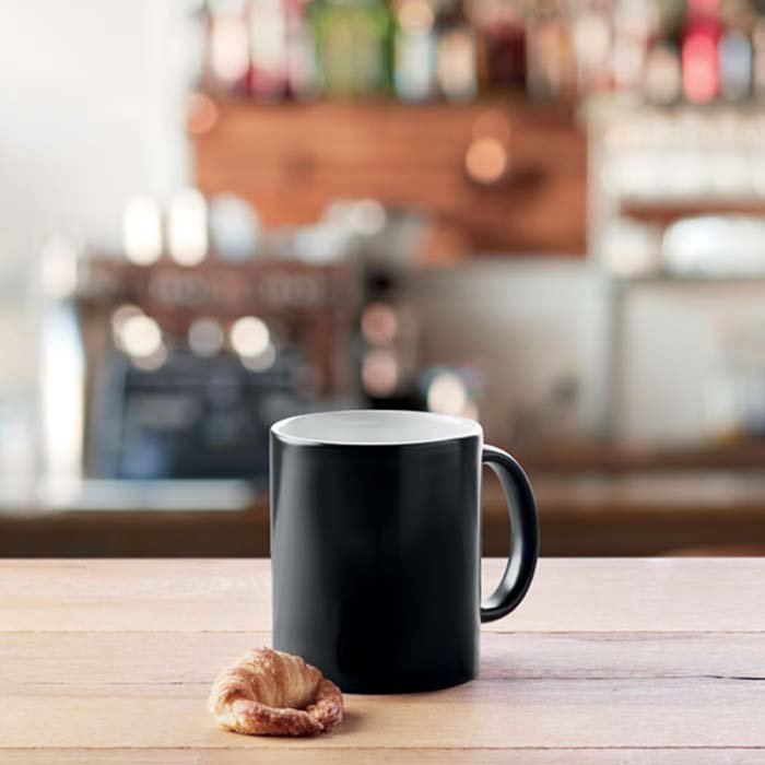 Ceramic mug of 300 ml capacity with special coating for sublimation. Mug changes colour to your personalized printing when pouring (at least) 50°C liquid into the mug. Individual packing in white carton box.