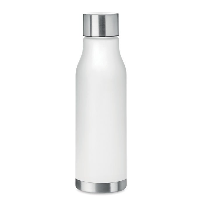 Drinking bottle in RPET with rubberised finish and stainless steel cap with inner RPET lid and silicone ring. BPA free. Leak-free. Capacity: 600 ml. Not suitable for carbonated drinks