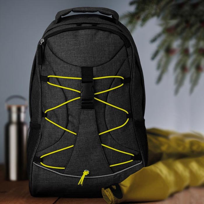 Backpack in 600D 2 tone polyester with colourful contrasting facing and glow in the dark cord on the front panel. Mesh pockets on both sides.
