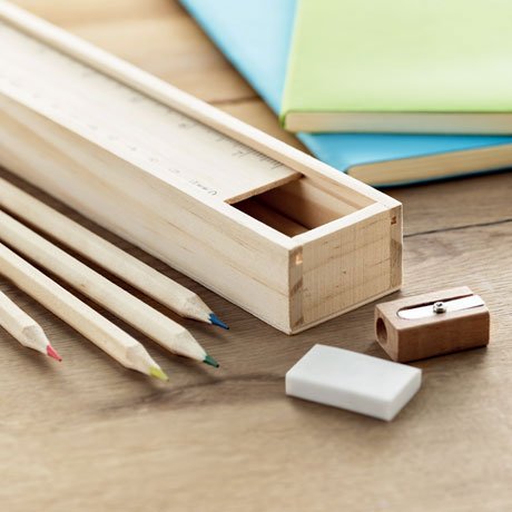 12 pieces stationery set with 2 pencils, 6 colouring pencils, 1 sharpener, 1 eraser and ruler incorporated in the lid of the wooden box.