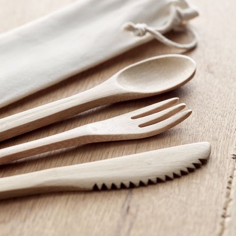 Re-usable bamboo cutlery set in canvas pouch. Includes knife, fork and spoon. As bamboo is a natural material, the colour per item can vary.