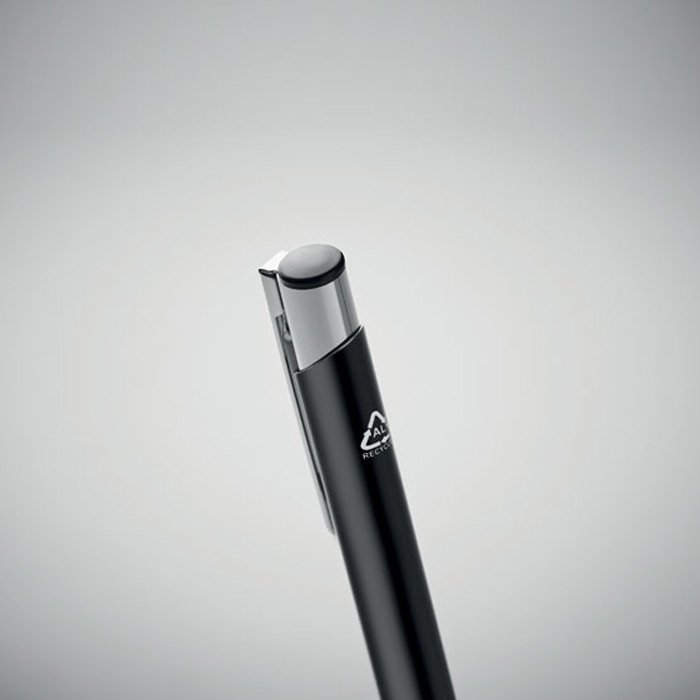 Push button ball pen in recycled aluminium. Blue ink. A classic and simple designed office essential. The aluminium barrel gives it a more premium look.