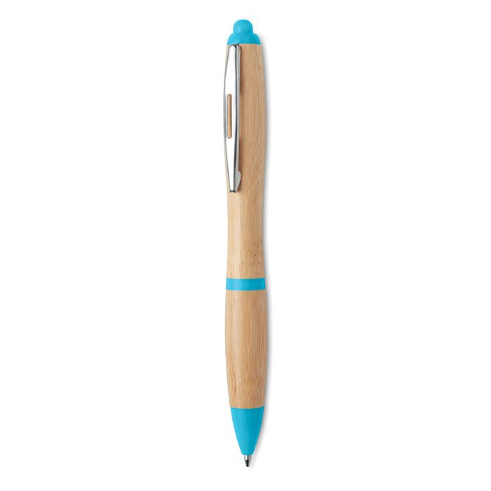 Push button ball pen with bamboo barrel and ABS fittings. Blue ink.