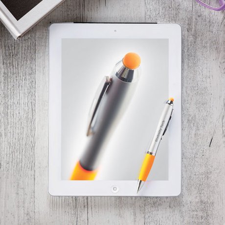 Twist action ball pen in ABS with stylus soft grip and matching tip. Blue ink.