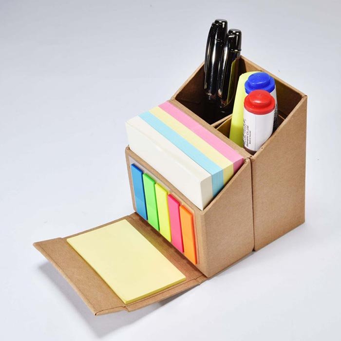 Foldable stationery box, comprising sticky notes, mini sticky note strips and notepad. Comes with slots to hold pens, markers and other accessories