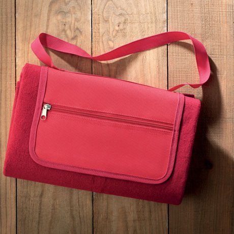 Foldable fleece blanket with plastic coated PEVA reverse side.