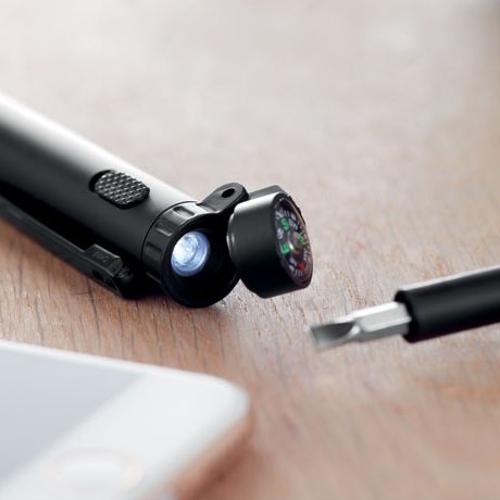 Multifunctional stylus tool pen in ABS matt finish with torch, screwdriver, phone stand, decorative compass, LED with white light.