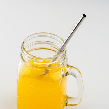 Set of 1 reusable stainless steel drinking straws and cleaning brush in microfiber pouch.