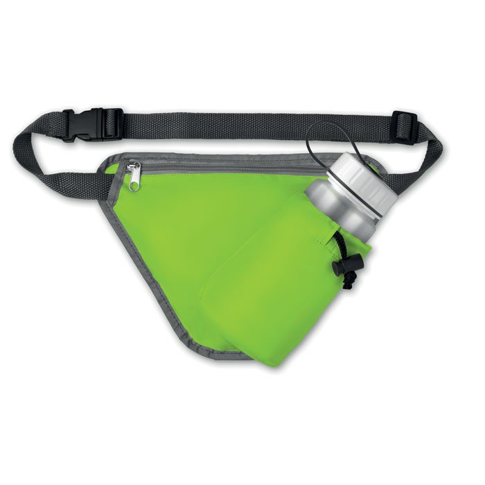 Waist bag in 600D polyester with bottle compartment in aluminium foil and reflective details.