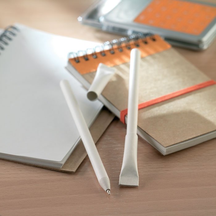 Ball pen with cap entirely made from recycled paper with blue ink refill.