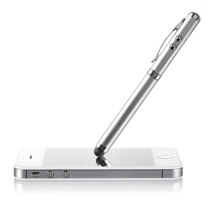 Laser pointer in metal. White LED light, red laser pointer and soft touch tip. Includes 3 button cell batteries. Delivered in metal tin box.