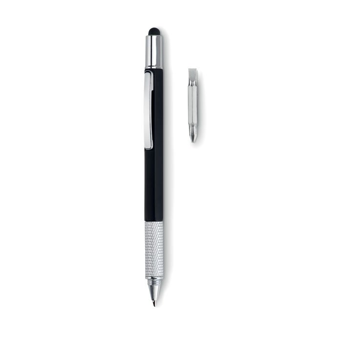 Twist action spirit level pen in ABS with ruler, stylus and phillips head and flat head screw driver bits. Black ink.