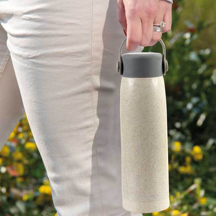 BPA free sustainable water bottle with glass interior and wheat straw exterior. Easy handle for carrying and a phone stand at the base. 380 ml.