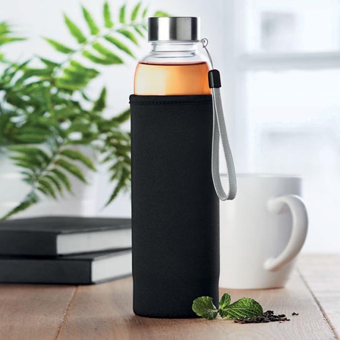 Single wall in high borosilicate glass bottle with tea infuser andneoprene pouch. Capacity 500 ml. Not suitable for carbonated drinks.Leak free. Laser engraving is not possible on borosilicate glass.