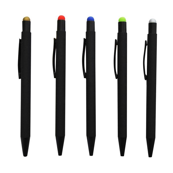 Aluminum material push pen with rubber coated body and a colored Stylus tip. Branding with colored mirror engraving effect. Blue ink.