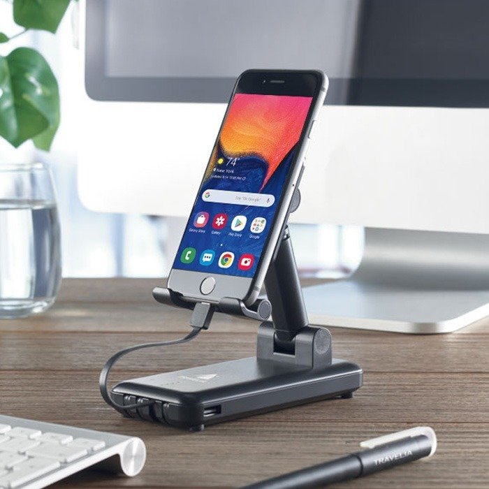 Power bank 10000 mAh in ABS with extendable and foldable phone holder. Integrated multi cables. Output: DC 5V/2A.