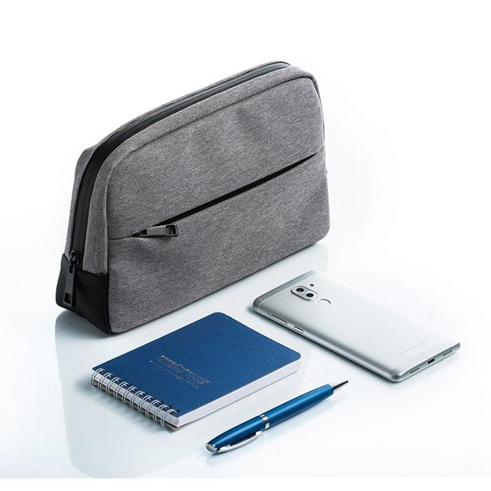 Trendy Pouch made with dual tone fabric and waterproof zipper. Premium matt finish zip puller on outside and Mesh pocket on the inside. Additional hidden zipper pocket on the front.